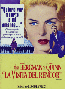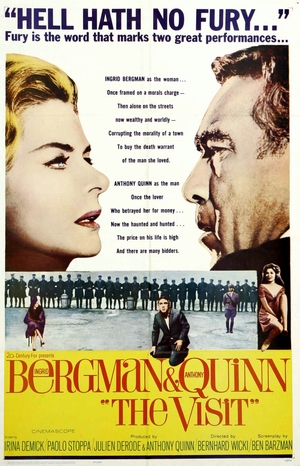 The Visit produced by Julien Derode, Darryl F. Zanuck and Anthony Quinn, is directed by Bernhard Wicki, who was nominated at 1964 Cannes Film Festival for the “Golden Palm”. The film also received a nomination for Best Costume Design (René Hubert) at the 1964 Academy Awards. While the music by Hans-Martin Majewski and Richard Arnell is gratifying, the Screenplay by Ben Barzman (“El Cid” (1961), “The Fall of the Roman Empire” (1964)), was criticized for being a bit glum, uneven and heavy for the average viewer and not cut for the talents of Bergman or Quinn.