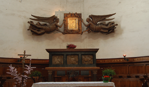 Top row Pic 1: Interior of BSG: The main altar; Pic 2: Interior of BSG: The Ark of St. Matthias in the right arm of the cross (by Giovanni Francesco de’ Sordi (1562)); Bottom row Pic 3: Interior of BSG: The main altar; Pic 4: Interior of BSG: The Corridor and Well of the Martyrs (1566). Statues of saints made of terracotta adorn the four surrounding pillars.