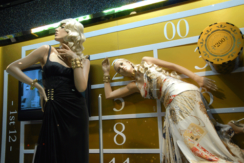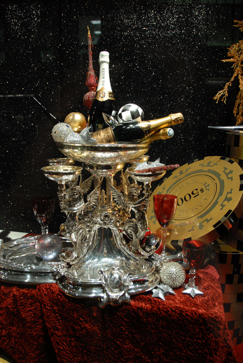 In 2006, when “Casino Royale”, the debut film of Daniel Craig as James Bond came out, the upmarket London store Harrods (in Knightsbridge) put up a beautiful display in all their frontage windows featuring gadgets and styles from that movie. Some of those lovely scenes in London, photographed by me, are presented below for your enjoyment….