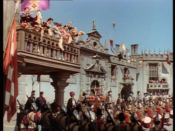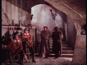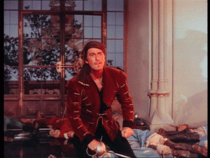 The specially constructed magnificent sets of the king’s palace and the grand staircase adds colour and dynamism to the expertly choreographed duel between the heroic Flynn and scoundrel Douglas which takes place to the splendour of Max Steiner’s rousing score. The initial scene at the balcony gives a richly coloured texture, the streets of 17th century London and Madrid, the entire palace including the dungeon were all arranged to provide a picture-book-look by providing due consideration to the minute details. Edward Carrere justly received an Academy Award for the Art Direction for this movie.