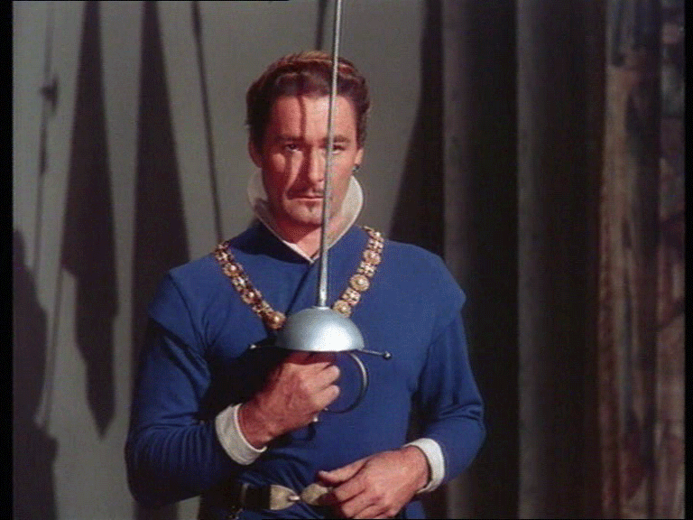 Buckinghamshire born stage actor Robert Douglas (Robert Douglas Finlayson – 1909-99) was a student of the Royal Academy of Dramatic Art and appeared on British stages before he moved to Hollywood after the war and specialized in roles of suave and arrogant villains. Douglas stars as the king’s illusory minister, the Duke de Lorca who had his heels on the king’s neck. This role was originally meant for Claude Rains and later for George Coulouris. Well versed in swordplay, Douglas had studio experience in having dueled with the likes of Stewart Granger, Robert Taylor, Burt Lancaster, etc. Douglas’ stylish daredevil duel with Flynn on the grand staircase in the king’s palace, though at times not totally fair, has by now attained cult status.