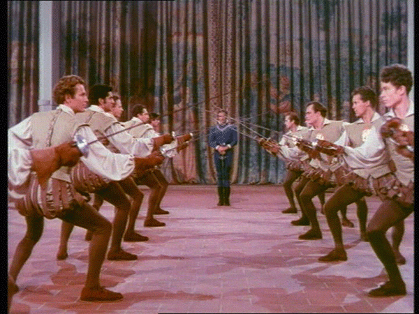 The enthralling dueling sequences were staged with a tongue-in-cheek approach by the team of Assistant Director Richard Mayberry, Fencing Master Fred Cavens and special-effects men William McGann and John Crouse blended together by maestro Sherman by casting doubles. The duel scenes in the dungeon, in the halls of the palace and on the grand staircase were aptly staged, even though Don Juan’s spectacular leap from the stairs during the duel was performed by Jock Mahoney (1919-89), the only stuntman who was willing to do that dangerous stunt and was paid S1,000 for it.