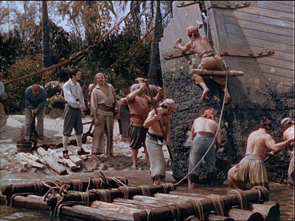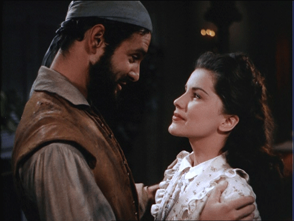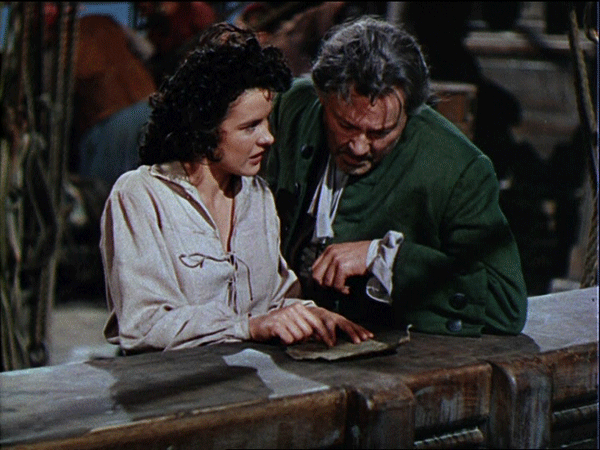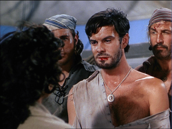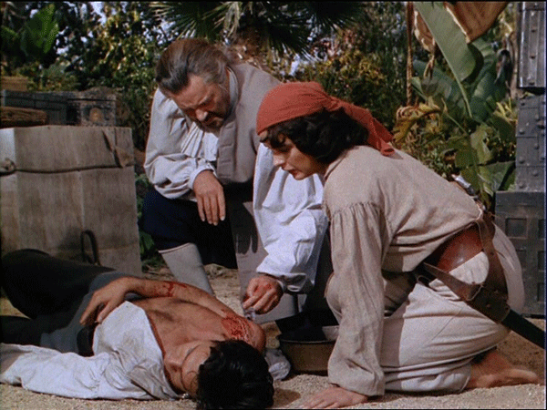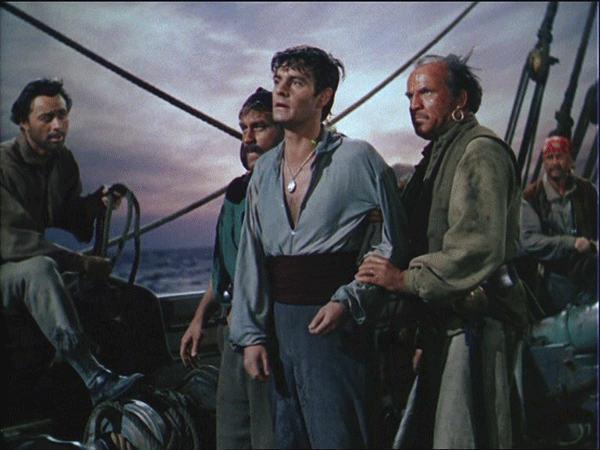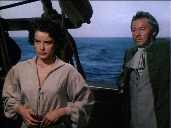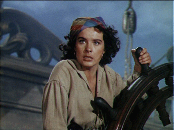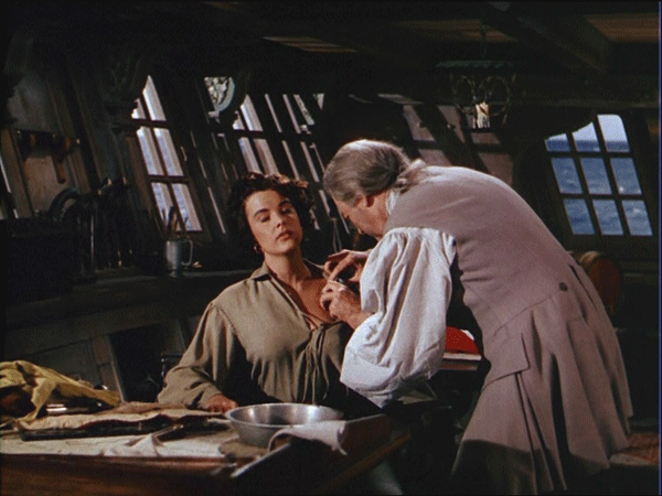 The film truthfully portrays Anne as a ruthless pirate who has denied her femininity and doesn’t know what it means to be a woman, or to be loved. In order to illustrate Anne’s crisis of identity, Tourneur used a scene in the beginning of the film to establish Anne’s strong heart and the softness of her bosom when Dr. Jameson tends to her wound. Despite Jean Peters’ cute and pretty looks which occasionally subdue her efforts to make Anne look dangerous and ruthless, her performance with an athletic agility is flawless though, couple of times, her cheerful countenance has appeared rather teasing.
