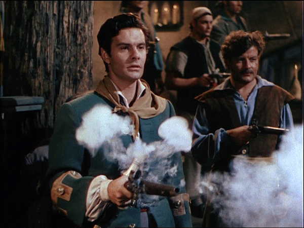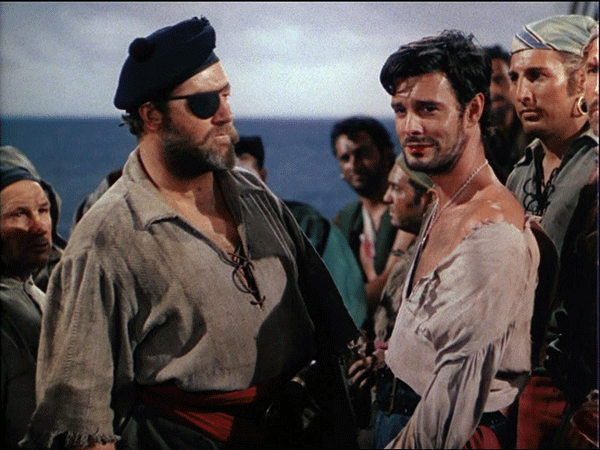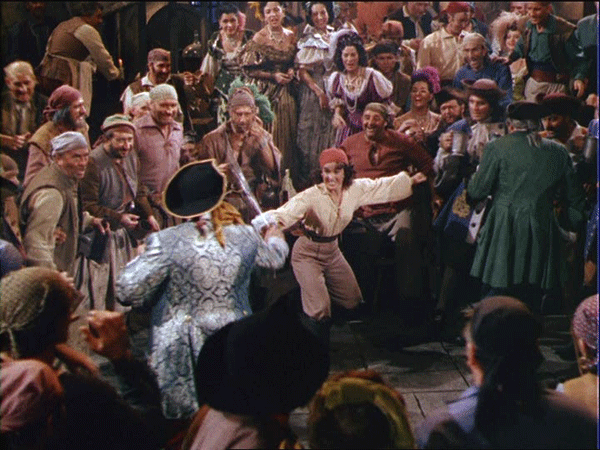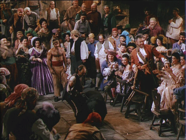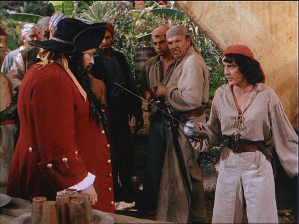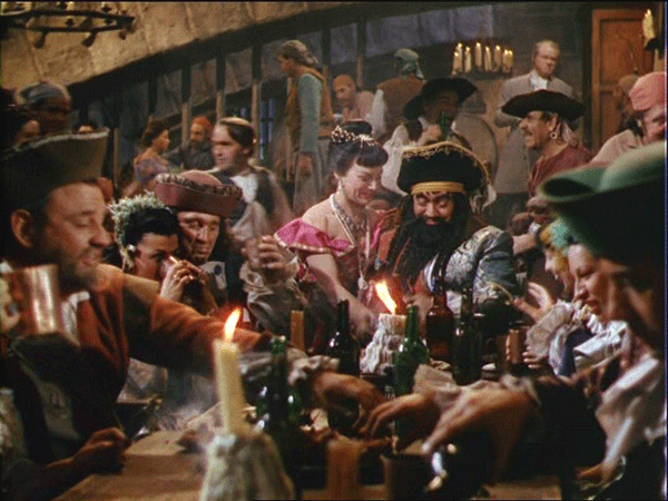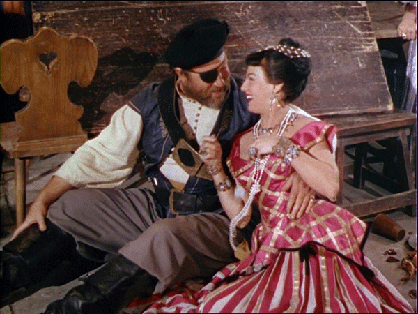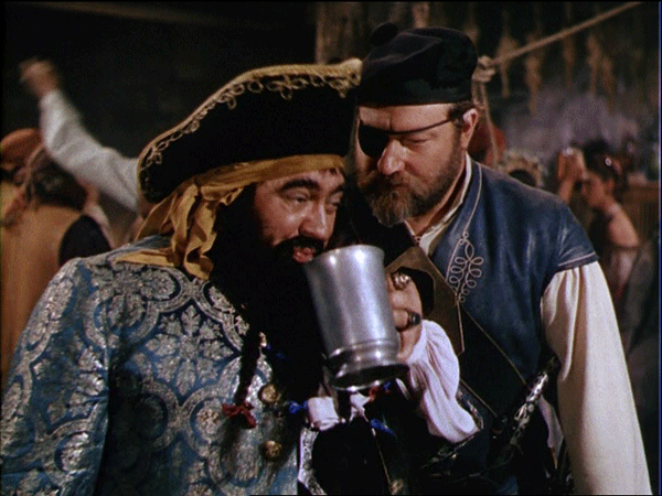In the role of the boisterous Blackbeard, the heavyset, stage character actor Thomas Gomez (Sabino Tomas Gomez – 1905-1971) made use of the opportunity to drink, laugh, turn tables, and swash his sword to realistically portray the larger-than-life of the renowned pirate.