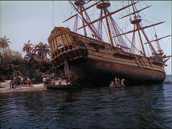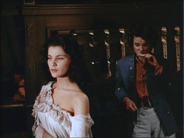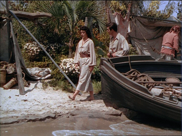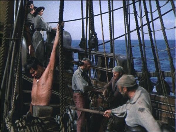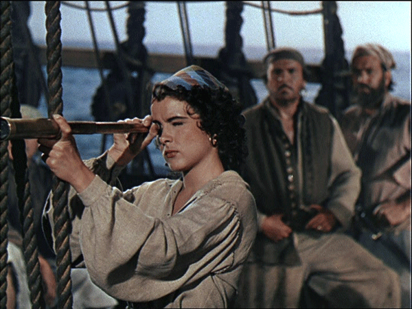 Although most of the costumes are standard pirate and navy gear which kept up the atmosphere, the feminine costumes for Jean Peters and Debra Paget and for some extras are very minimal. Apart from the yellow dress Anne wears inside the make-shift cabin, the other one is a white nightgown shown in very dim lighting as she gazed at the glittering sea.