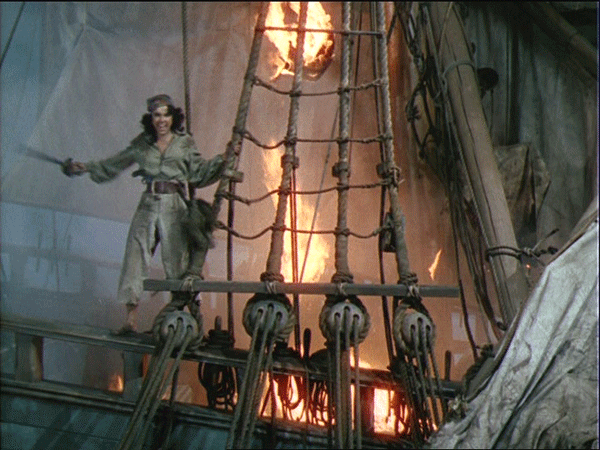 As the movie begins, we are shown the names of two English ships, Royal Charles and Sea Lady are being stricken off a register of ships for having been destroyed or sunk by the notorious Captain Providence. We then cut to: the deep ocean off Antigua where the English vessel Gemini is preparing to repel the attack of Anne’s flagship Sheba Queen. As the two ships draw nearer and the canons started firing, Anne suddenly appears on the deck of her ship while her men valiantly fought the English, their swords flashing in fierce combat. Even Anne joined her men in the fight. Before long, the English Captain had surrendered.