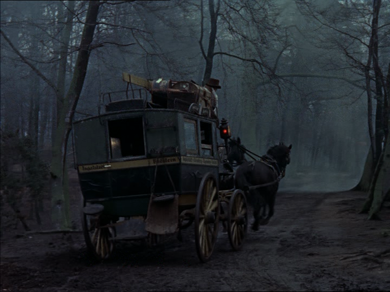 After the credits are shown, the movie opens when a horse-driven carriage is rattling and shaking its way through a muddy track cutting across the wet and misty Transylvanian forest. The carriage’s route-board showed: “INGOLSTADT-ABENSBERG-REGENSBURG-BADSTEIN”*. A voice-over narration is heard: