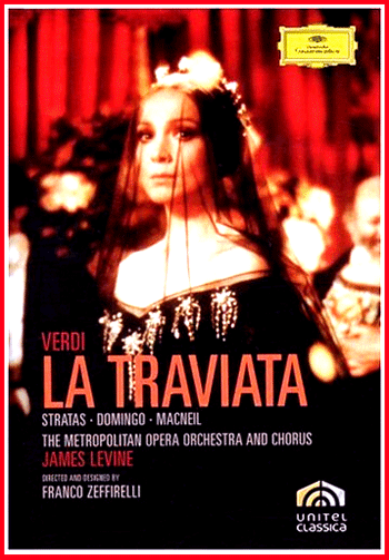 40Like Joseph Losey’s “Don Giovanni” (1979) and Francesco Rosi’s “Carmen” (1984), “La Traviata” has also spawned its film versions. Besides “The Lost One” (1947, original title: “La signora dalle camelie“) in English by director Carmine Gallone starring Nelly Corradi; and the 1968 film musical of Mario Lanfranchi, starring Anna Moffo and Franco Bonisolli; Franco Zefferilli’s production of “La Traviata” came out in 1982 starring Teresa Stratas and Plácido Domingo backed by the Metropolitan Opera Orchestra and Chorus.