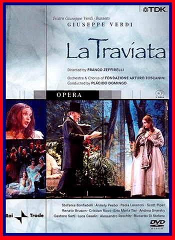 4)    DVDs and other audio/visual media of “La Traviata” including the Glyndebourne Festival Opera version (1988) directed by Peter Hall (from which images are shown under the “Synopsis” above) are available with main dealers such as amazon.com, TCM Shop, etc.