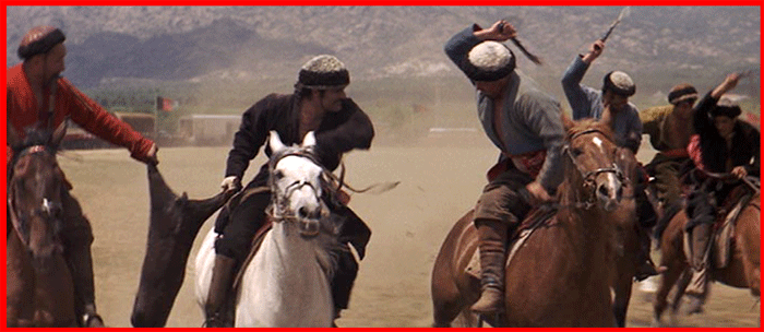 The game featured in the movie, where the horseman with the carcass is fair game for an all-out assault, was played at its roughest when the leather whips were applied with devastating effect on challenging riders.