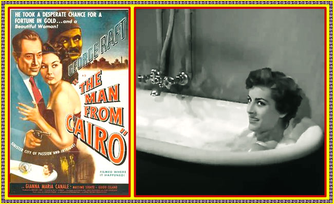 Irène Papas acted as Yvonne Lebeau, a dancer at Cote Bleu, a little nightclub in downtown Algiers in The Man from Cairo (Crime Squad/Dramma nella Kasbah, 1953). Based on story by Hungarian novelist Ladislas Fodor and directed by Ray H. Enright (and Edoardo Anton – uncredited), it was filmed on location in Algeria and Italy. The movie center upon a fortune in gold, lost on the North African desert, which lures a variety of wealth-seekers. After many twists and turns, an American tourist and General Dumont solve the mystery of the lost gold. Although Irène only had a short spell in the earlier part of the movie, George Raft, Gianna Maria Canale, and Massimo Serato in prominent roles had better scope to display their acting talents;