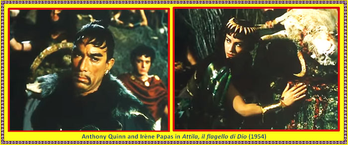 In 1954, Attila (Attila, il flagello di Dio/Attila, Hombre o Demonio/Attila, fléau de Dieu) was released with Irène in the role of Grune. The film featured the cult of the most ruthless conqueror of all time – the barbarian Attila the Hun who, with sword and flame, swept across the civilised world in the year 450 A.D. Even the mighty Roman Empire was marked for his conquests. A Dino De Laurentiis and Carlo Ponti production for Lux Film, directed by Pietro Francisci (1906-1977), Anthony Quinn gave the title role pure savagery while romancing Sophia Loren in the role of Attila’s woman Honoria. Jo