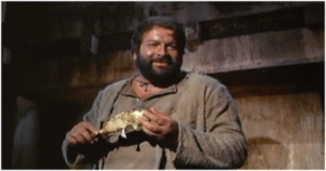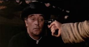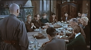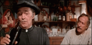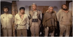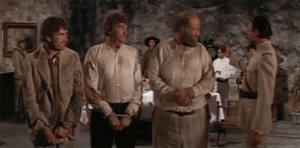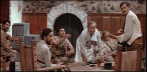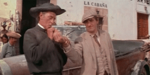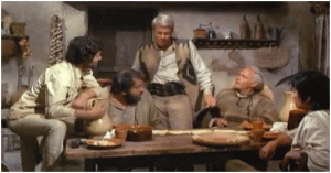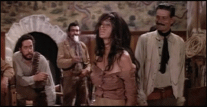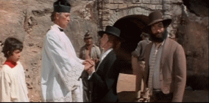 All at once, the groups’ attention was diverted by a native Indian girl the rurales had found on the upper floor. Despite objections by Tacho, the frightened old man at the bar who claimed that she is dumb, the fascination for their object of amusement set off a string of merriment and abuse by the rurales led by Delgado which was ineffectually thwarted by the girl until Keogh interfered. But his challenge was short-lived, only long enough for the girl to move over to his side. Once again he was accosted from the back by yet another rurale. Keogh was soon roped and hung up on the wooden beam above. It was then the priest came in with his Gladstone bag, and put up one hell of a defense in a homicidal manner. God works in mysterious ways.