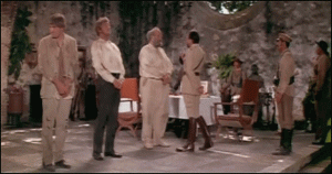 Rita Hayworth had to struggle in her role of Senora de la Plata, which is a variation from the characters in the novel. At the doorstep of Alzheimer’s disease, her face had turned into that of a matured woman who had gone through many hardships in her life. Supportive to Hayworth, Mitch had considered her casting as an opportunity to renew their friendship. When Hayworth strived to remember her lines, the crew believed her to be in a state of intoxication from alcohol intake, and they were helpful to her, especially hairstylist Lynn Del Kail. But none of that could assuage her memory lapses, or reading from large cue cards, which is common practice in Hollywood. Even experienced actors like Marlon Brando (maybe due to dyslexia) frequently used them, albeit director Bernardo Bertolucci refused to have it written on actress Maria Schneider’s back for Brando to read conveniently during filming of “Last Tango in Paris”.